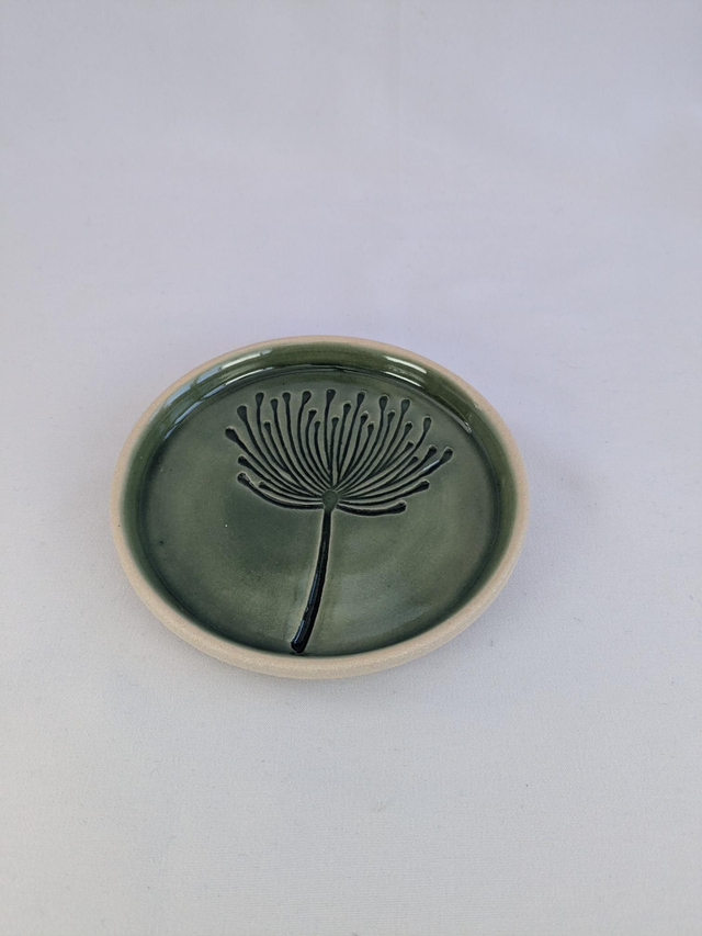 Handmade green stoneware trinket dish. Approximately 11.5 cm wide, 1cm high.