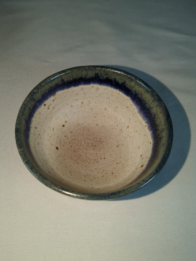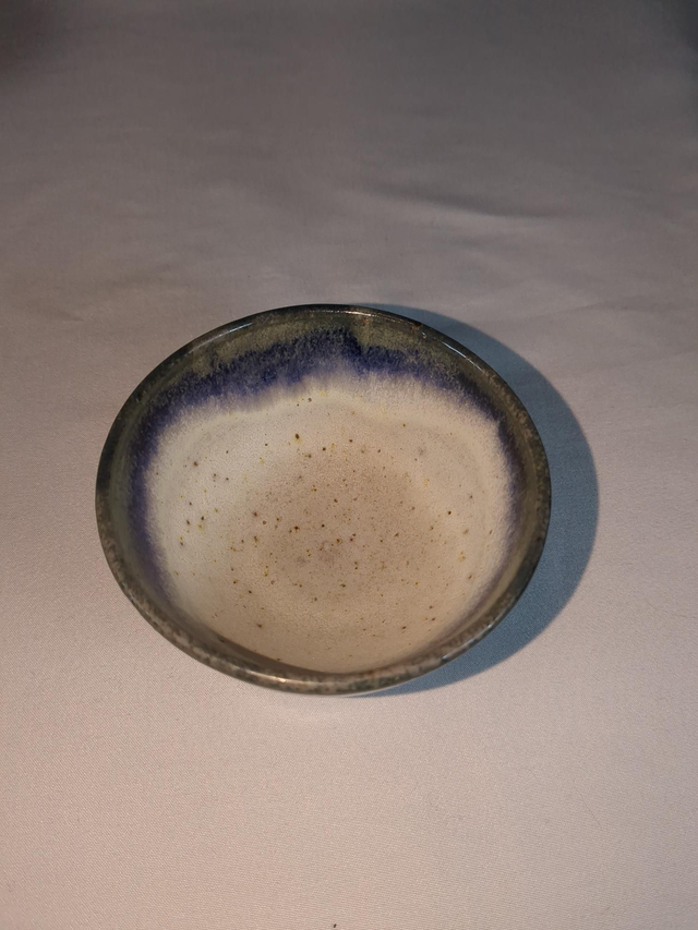 Small blue and light oatmeal stoneware bowl. Approximately 7cm to 8cm wide by 4.5cm high. (sizes vary)