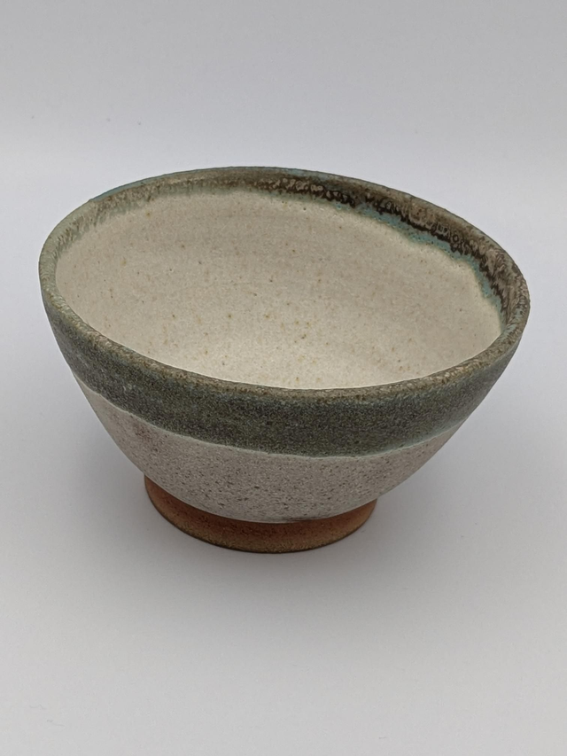 Handmade stoneware turquoise and light oatmeal bowl. Not good safe. Approximately 6cm high, 11cm wide.