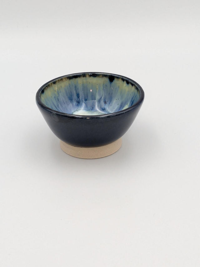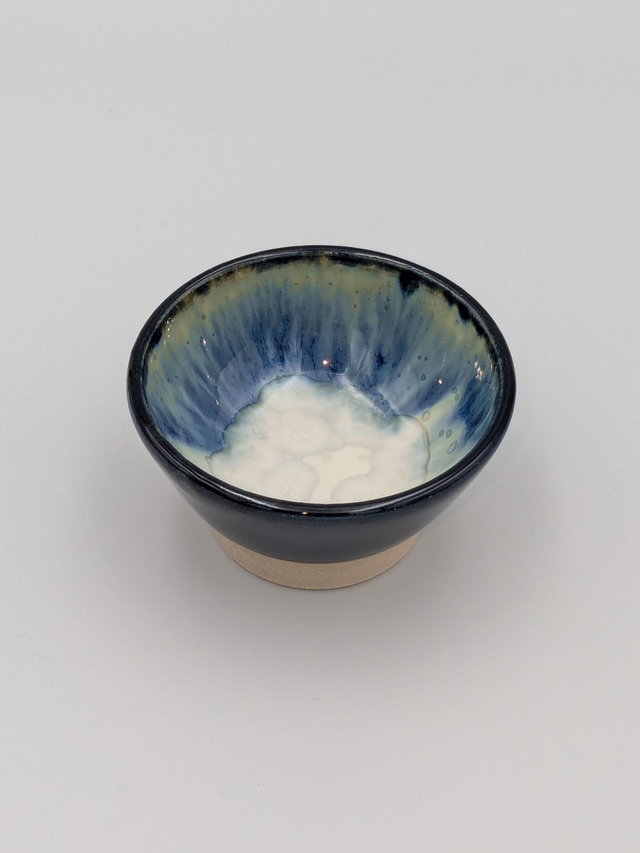 Mini trinket bowl.dark blue with blue, green and white chrystal center. Approximately 7.5cm wide, 4.5cm high.