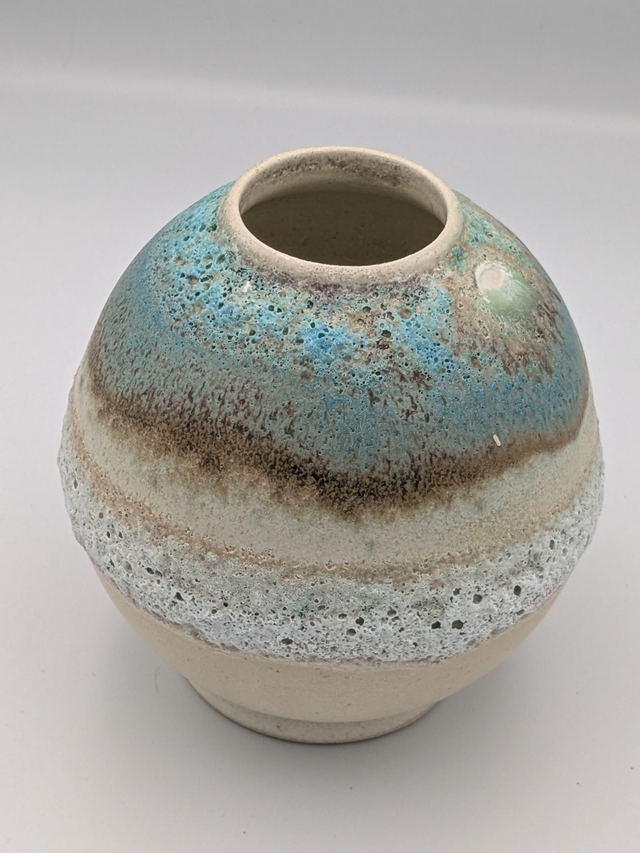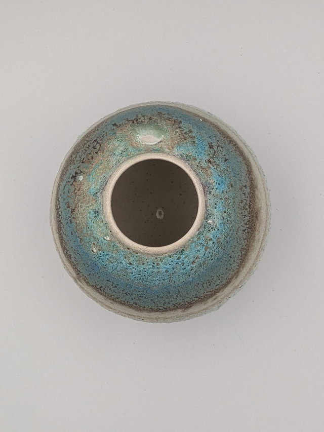 Handmade stoneware turquoise and light oatmeal moon jar with volcanic glaze. Approximately 14cm high and 13cm wide.